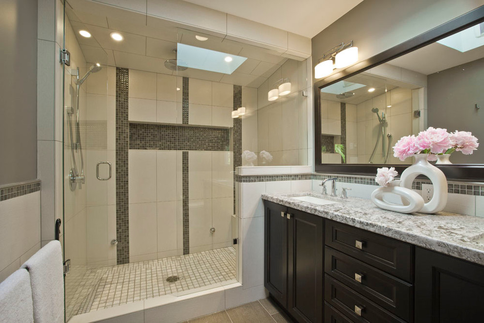 And the more you put into the bathroom the. This board shows you just how good they can look. Design ideas for a mid sized contemporary master bathroom in melbourne with marble benchtops flat panel cabinets light wood cabinets a drop in tub a one piece toilet brown tile gray tile white tile white walls a vessel sink and brown floor.