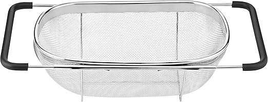 Qimh colander collapsible colander strainer over the sink vegetablefruit colanders strainers with extendable handles folding strainer for kitchen6 quart green by qimh. Cuisinart over the sink colander buy on amazon buy on walmart buy on ebay this large 5 12 quart colander has extendable nonslip handles that fit across almost any sink so you can rinse vegetables or drain pasta while keeping the bottom of the colander safely above the floor of the sink. By easily resting inside the kitchen sink or atop the counter the vigo kitchen sink colander includes vinyl corner protectors feet and side bumpers to prevent scratches.