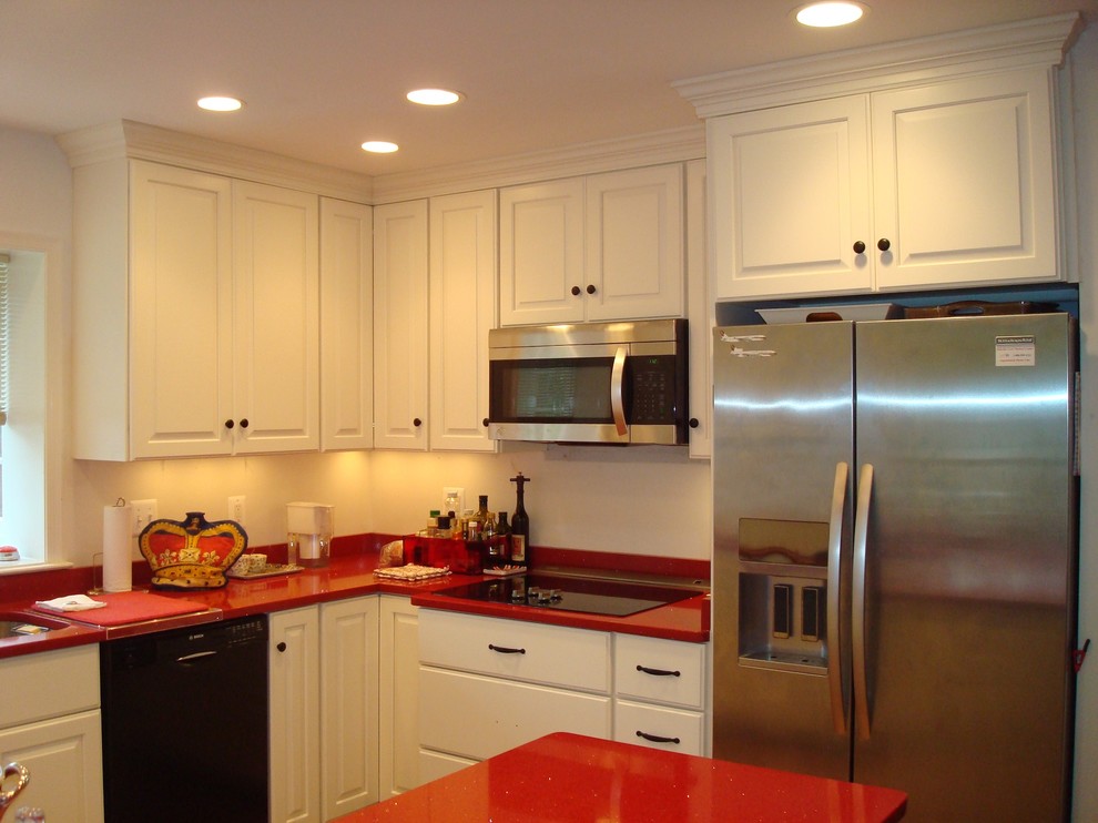 Kitchen with red countertops. As you all know i love the colour red. Red counter tops really do suit kitchens with lighter cabinetry its that whole. L shaped kitchen with modern glossy red kitchen cabinets gray countertops and white walls.