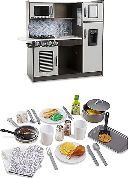 The 22 piece set includes a pot with lid frying pan cookie sheet spatula serving spoon two plates two cups two forks two knives two spoons and a timer all made of durable plastic that are top rack dishwasher safe. Melissa and doug kitchen accessories melissa doug kitchen accessory set pretend play durable construction companion to kitchen sets 22 piece set great gift for girls and boys best for 3 4 5 year olds and up. This melissa doug kitchen play set is a great companion to other melissa doug kitchen toys and play spaces.