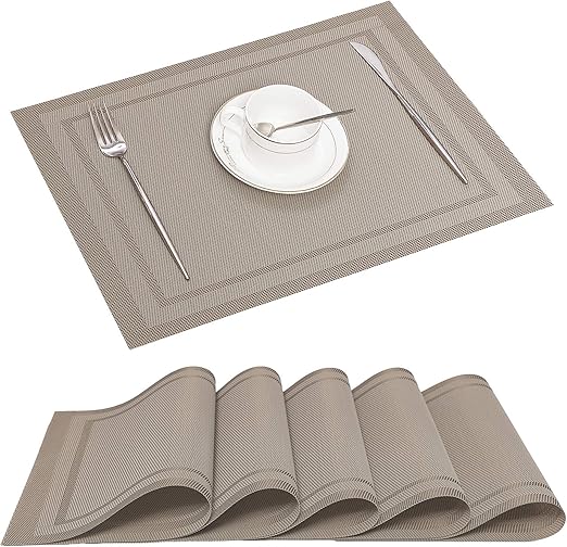 Tennove placemats set of 6 woven vinyl table mats pvc placemats kitchen dining table decoration flower brown 46 out of 5 stars 575. Viomir woven vinyl placemats set of 6 wipeable pvc plastic easy to clean heat resistant stain resistant non slip placemats for dining table indoor outdoor. 45 out of 5 stars 246.
